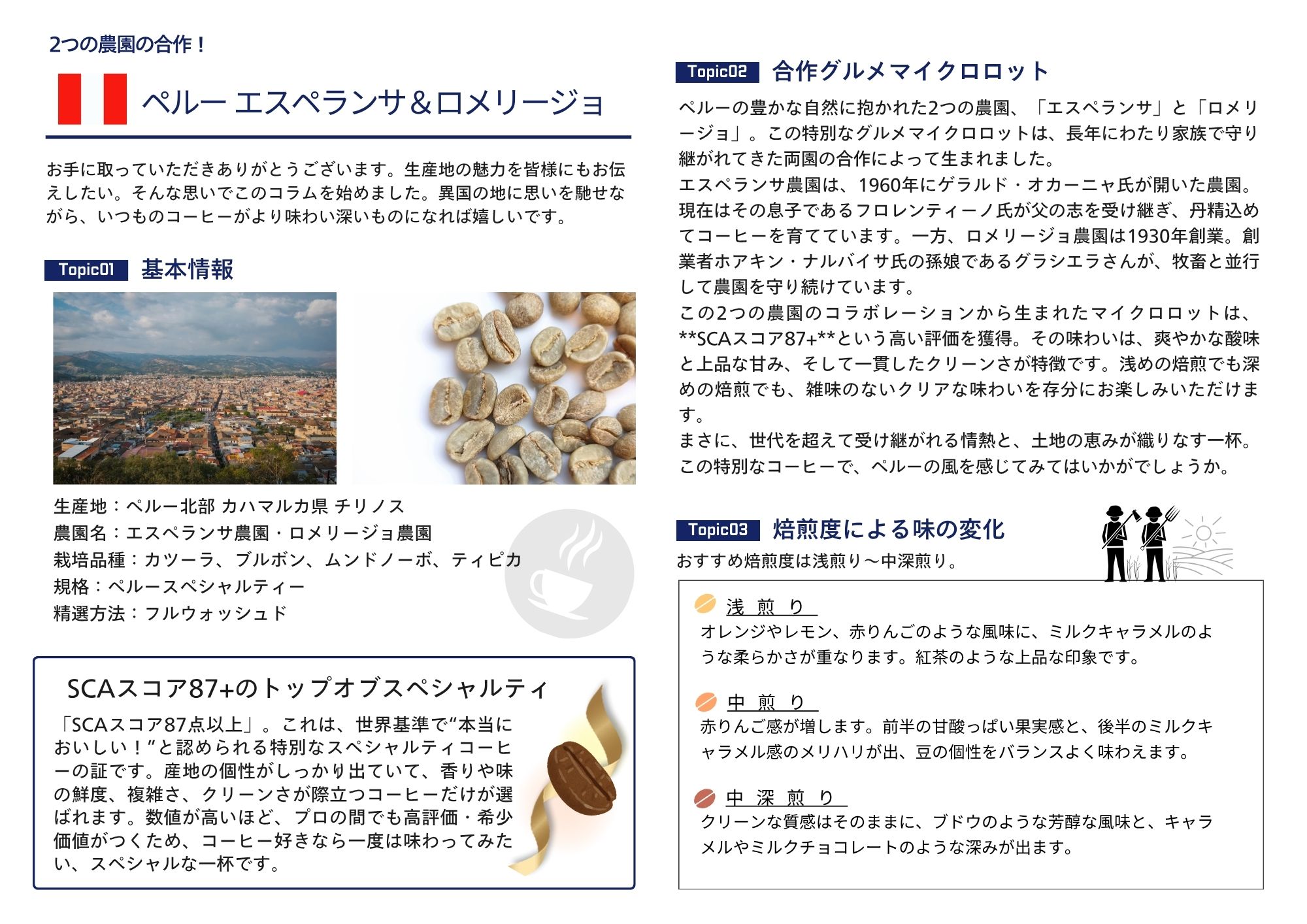 隣接するエスペランサ農園とロメリージョ農園の合作グルメマイクロロット。スペシャルティコーヒーの中でも高得点を獲得した高品質な味わいをぜひお楽しみください。