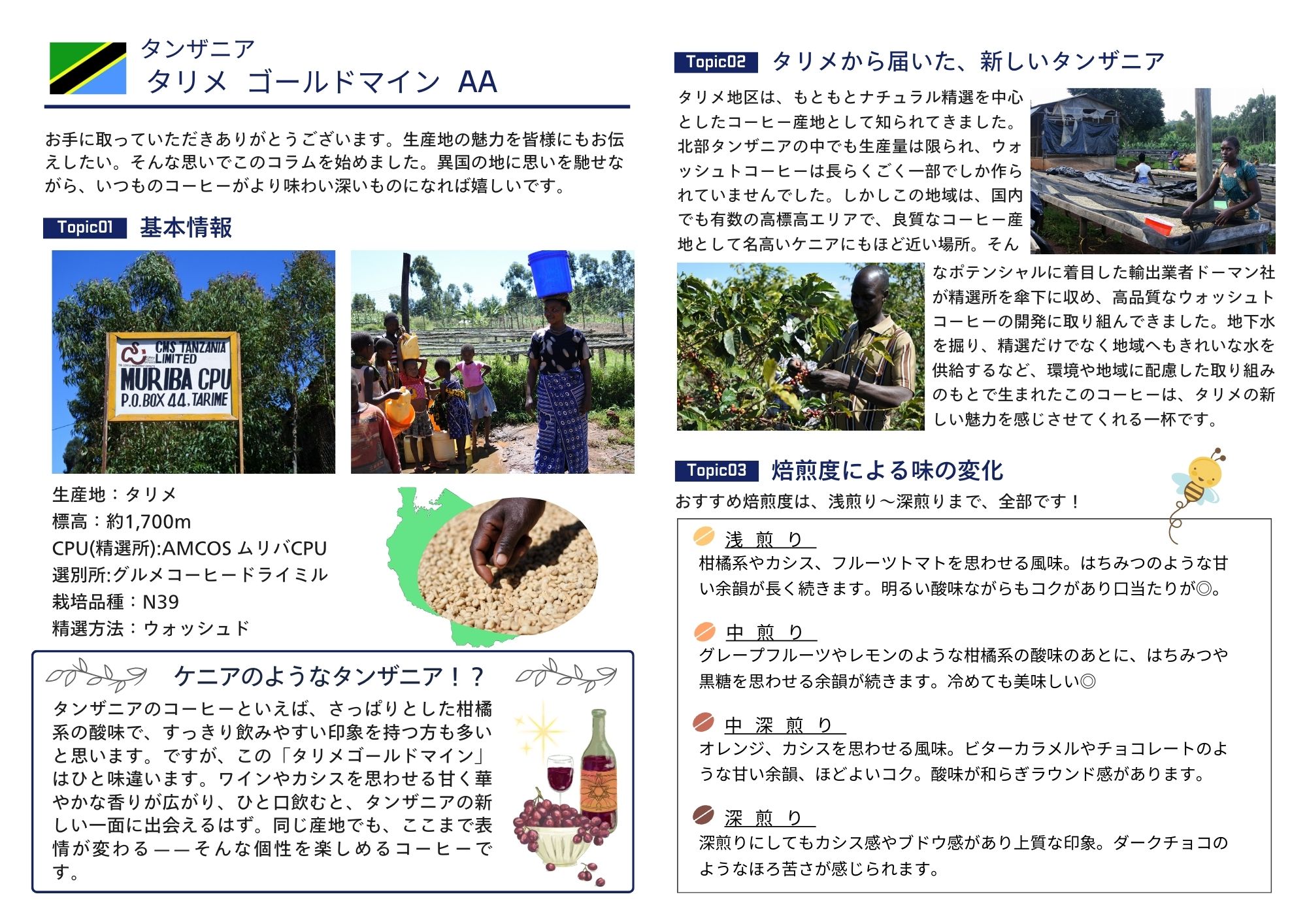 タンザニア北部・タリメ地区から届いた、奥行きが魅力の一杯。この機会にぜひお楽しみください。
